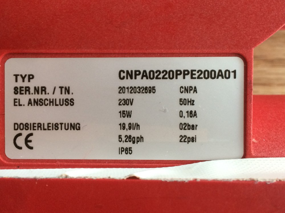 Water pump Prominent. The water pumped for 1 hour has been poured in a plastic container seat on a scale to measure exactly the water passed through the E-Cat.