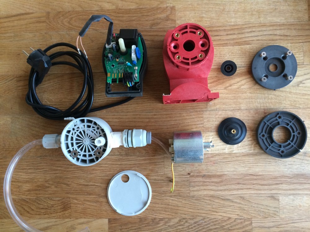 Water pump Prominent. The water pumped for 1 hour has been poured in a plastic container seat on a scale to measure exactly the water passed through the E-Cat.